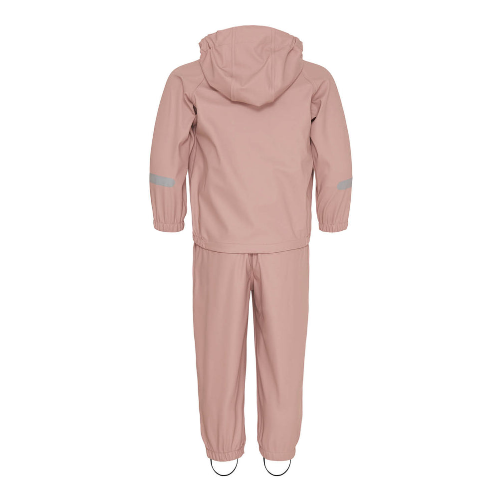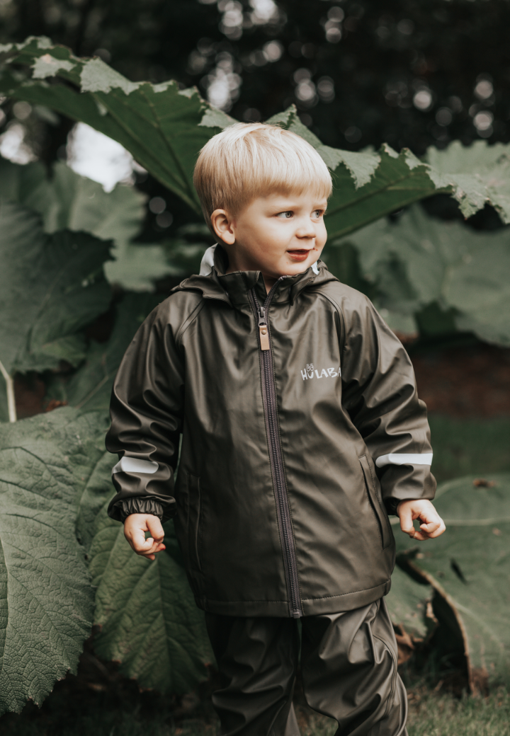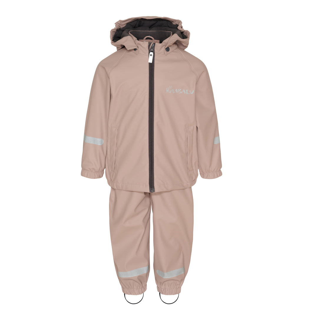 Regnsæt til børn fra Hulabalu, med refleks på ærme og ben. Elastik ved ærme og ben, samt aftagelig hætte.
