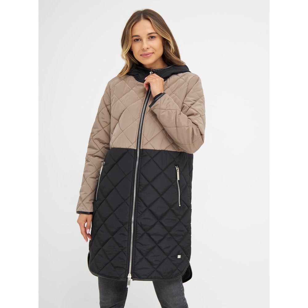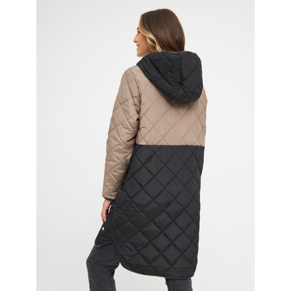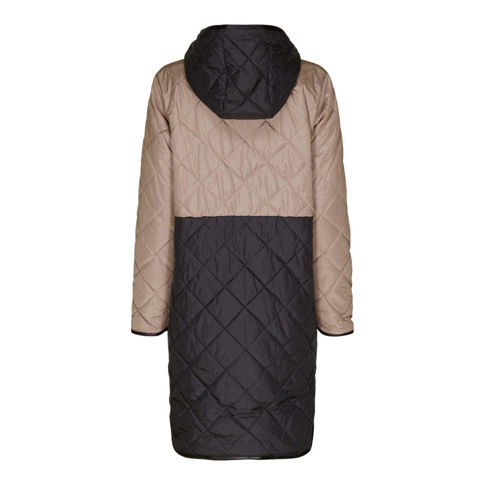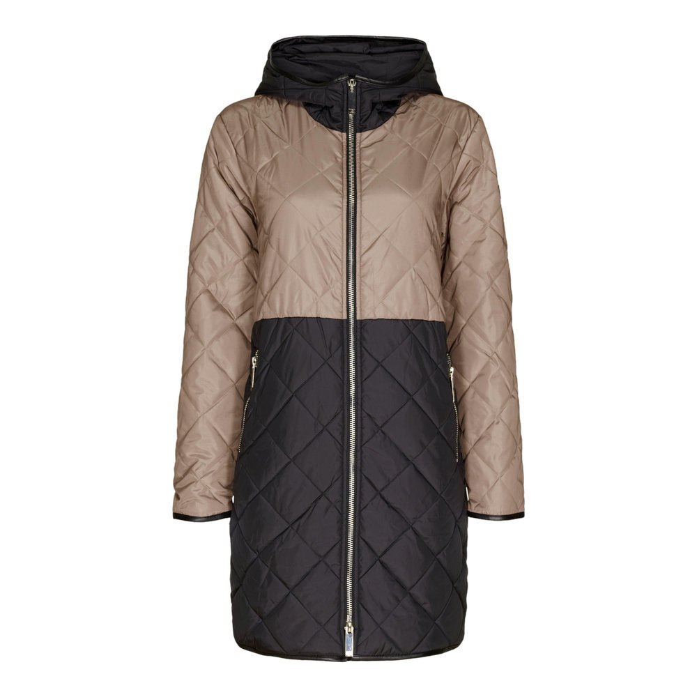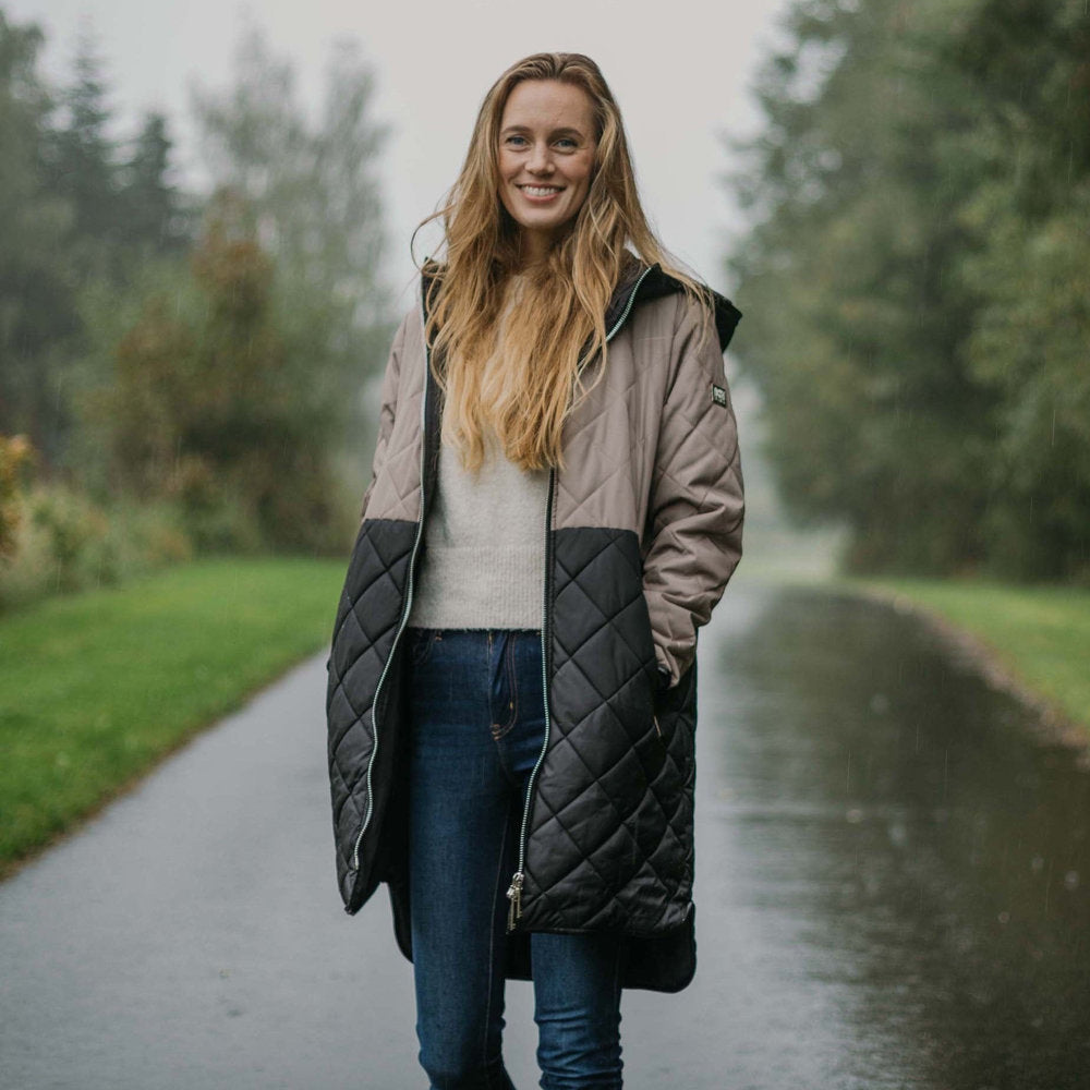 Elegant lang overgangsfrakke med fine detaljer i sølv. Jakken har en stor hætte, der beskytter halsen de kolde dage, er god i regnvejr og giver jakken et frisk udtryk.