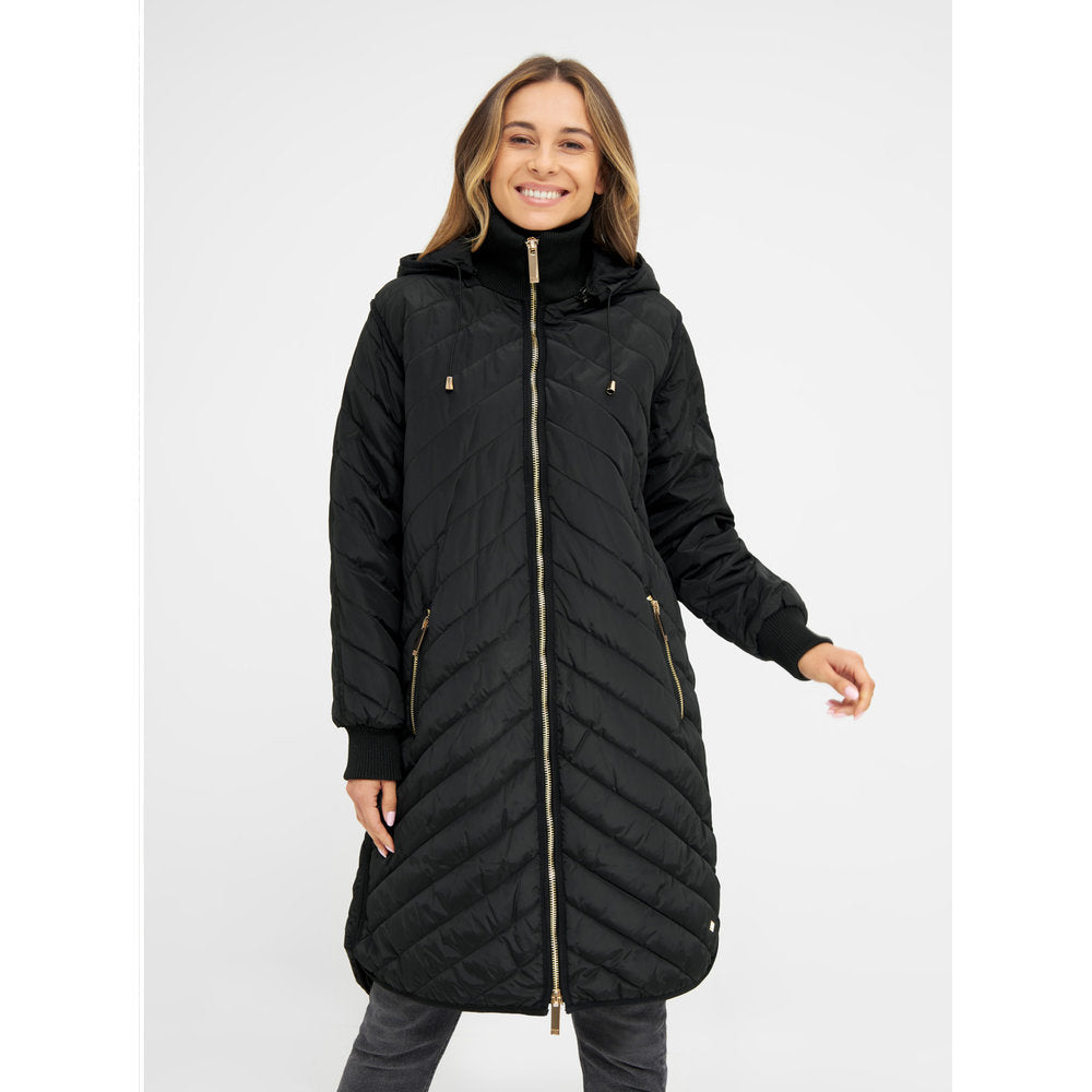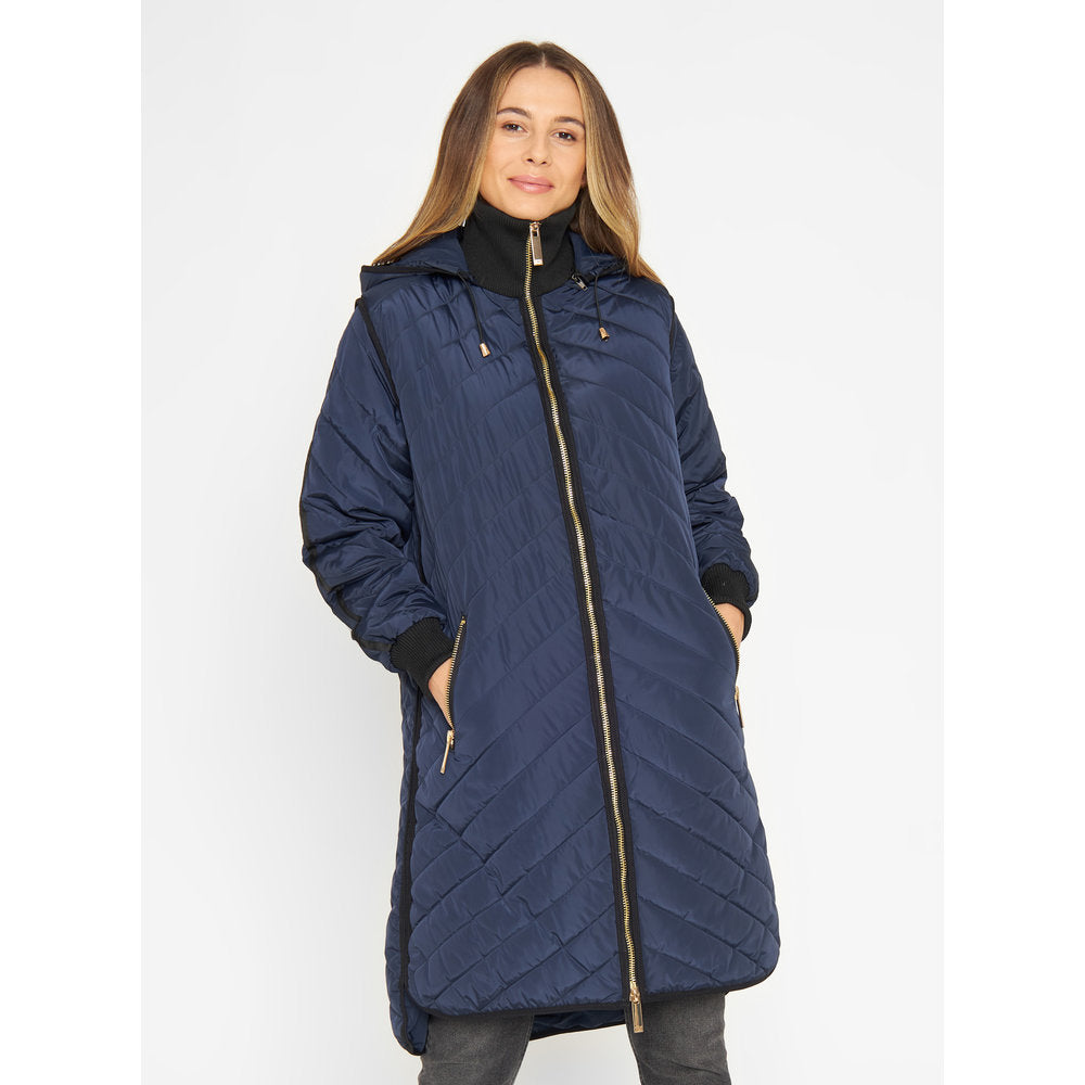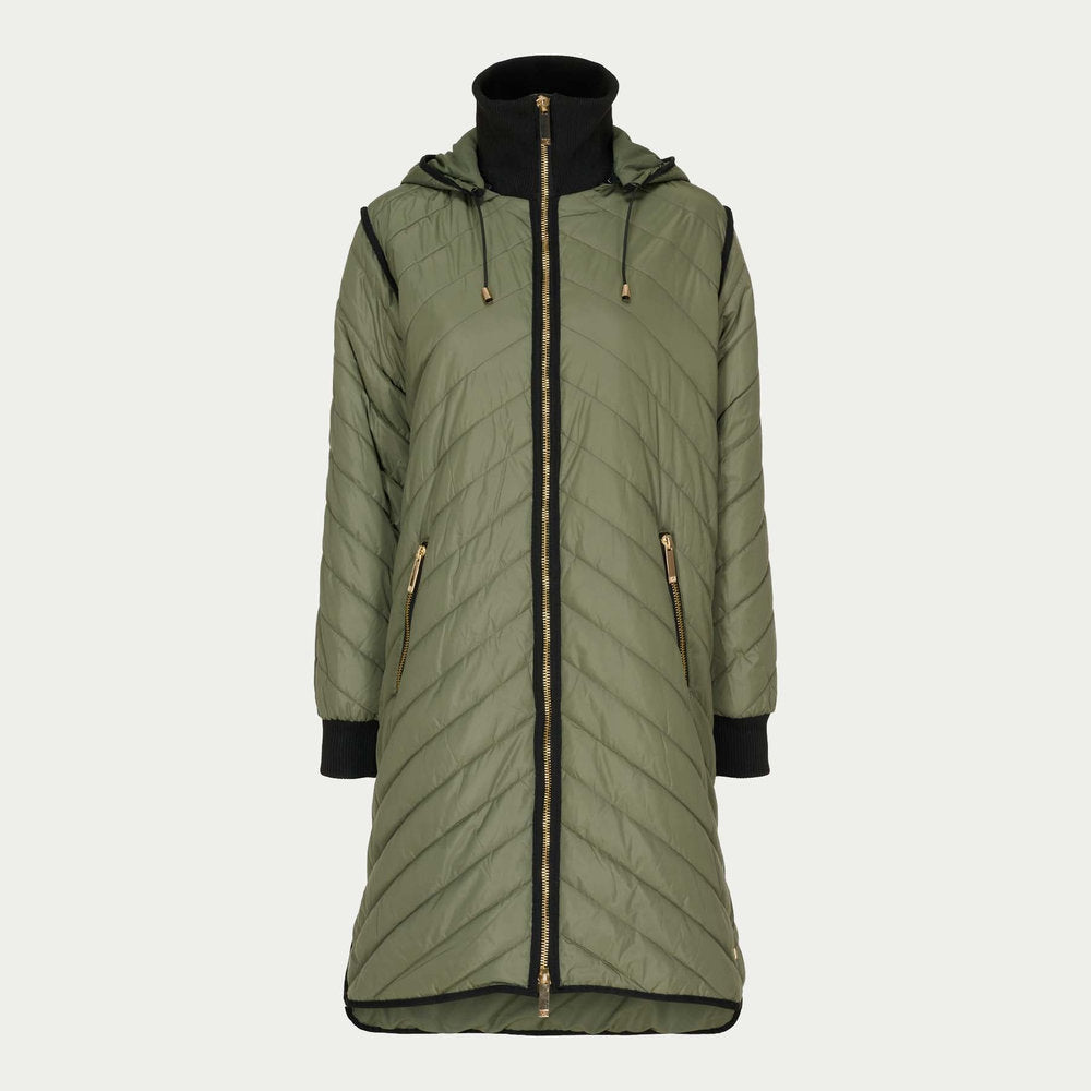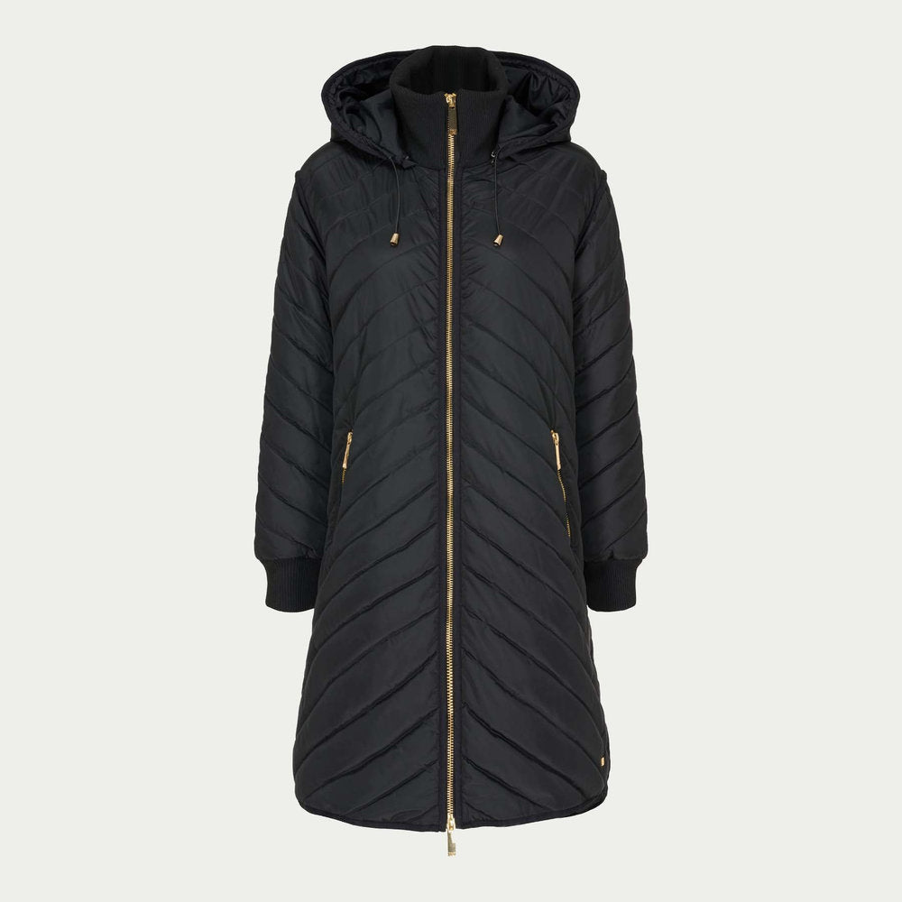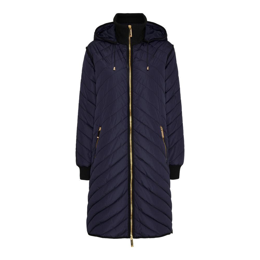 Elegant lang overgangsfrakke med fine detaljer i messing/guld. Jakken har en rummelig pasform, som klæder alle kvinder.