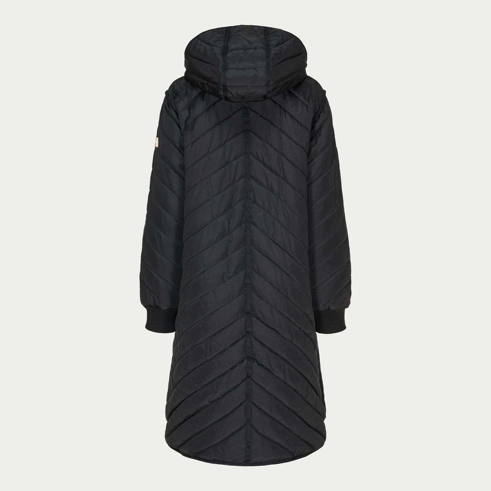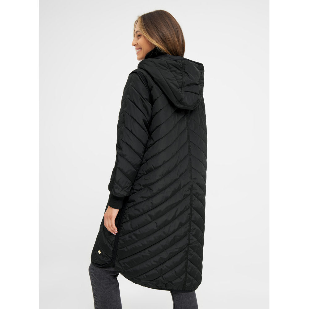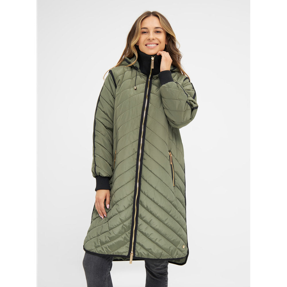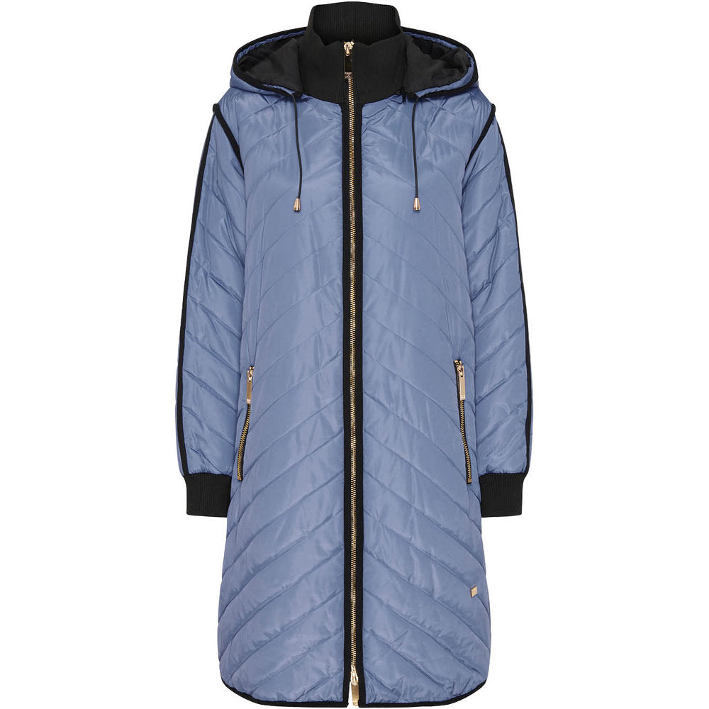 Elegant lang overgangsfrakke med fine detaljer i messing/guld. Jakken har en rummelig pasform, som klæder alle kvinder.