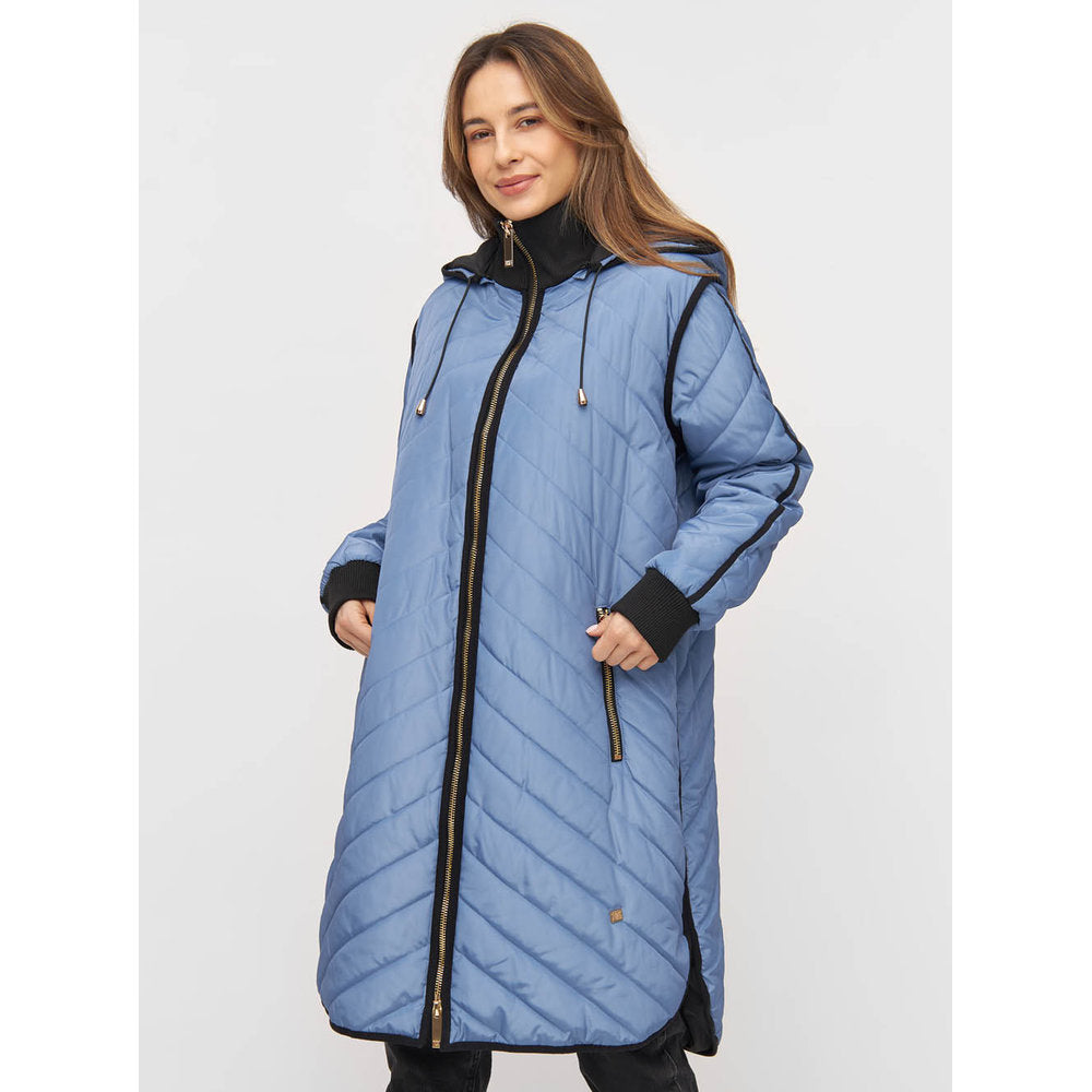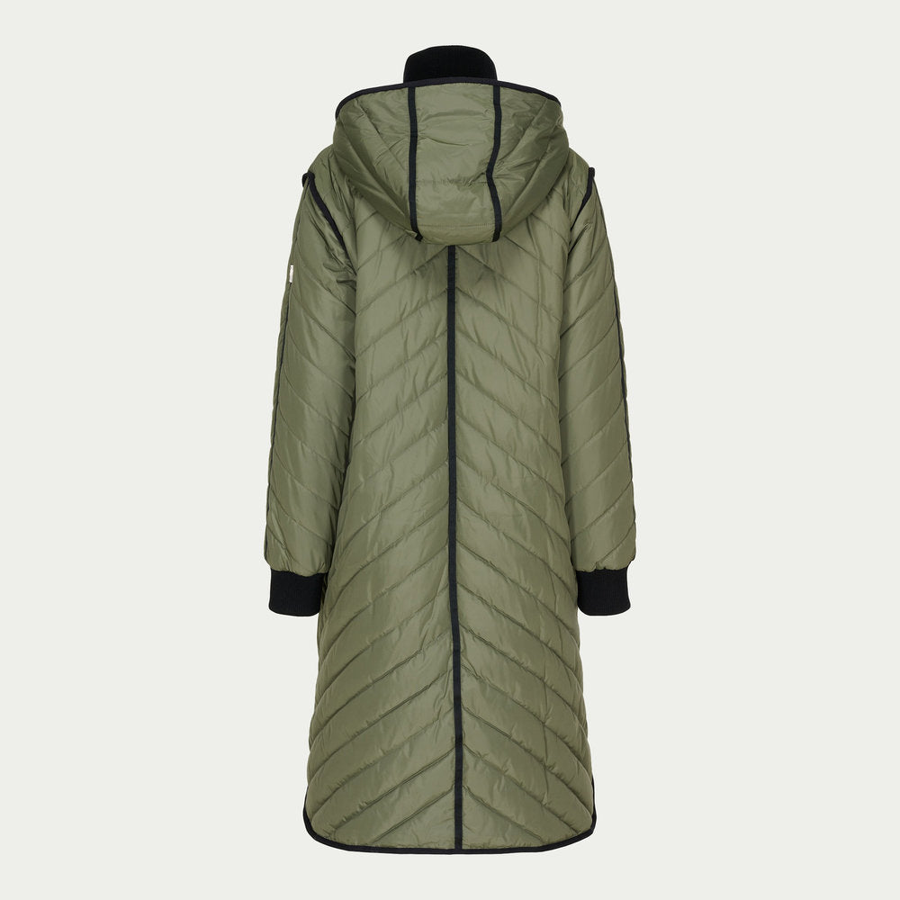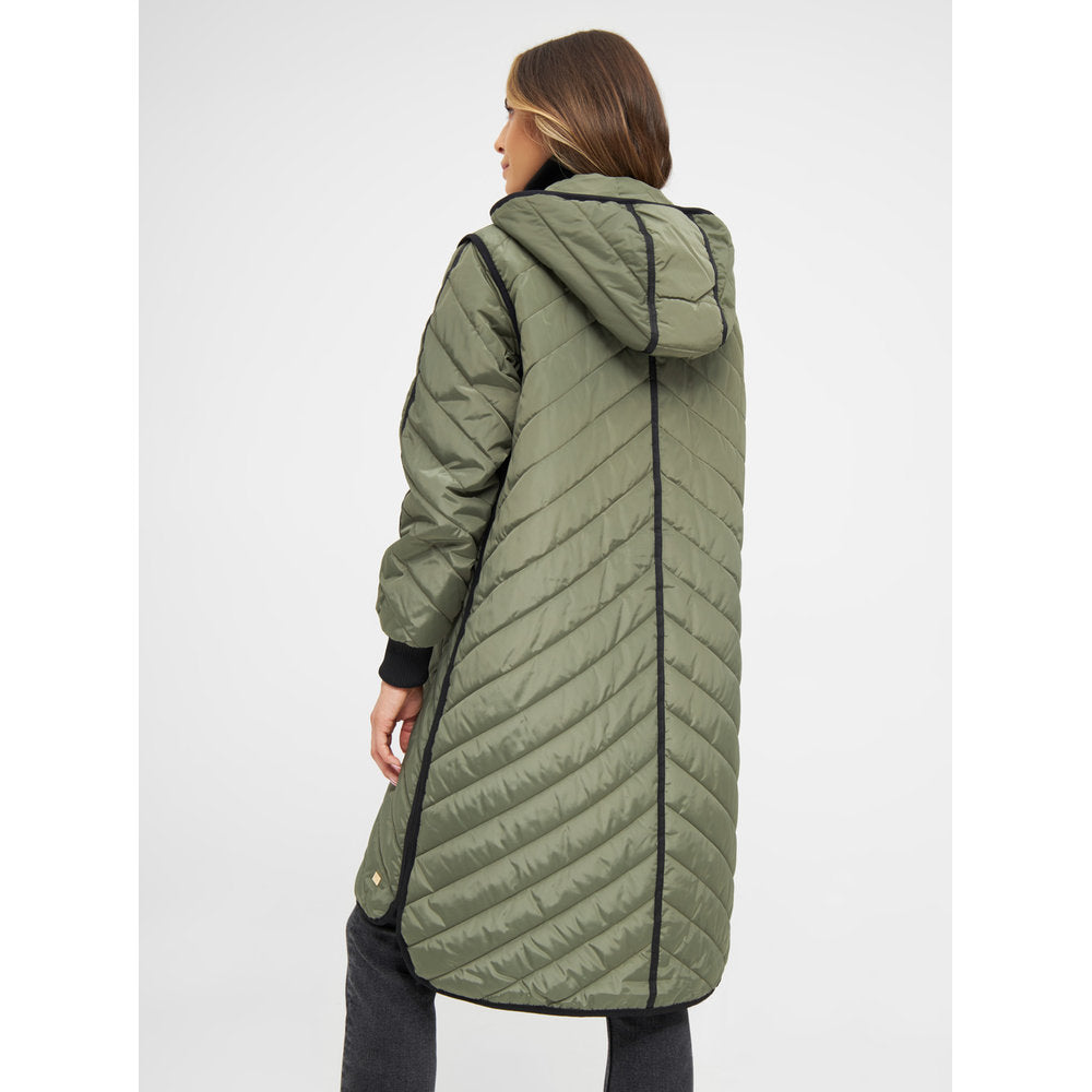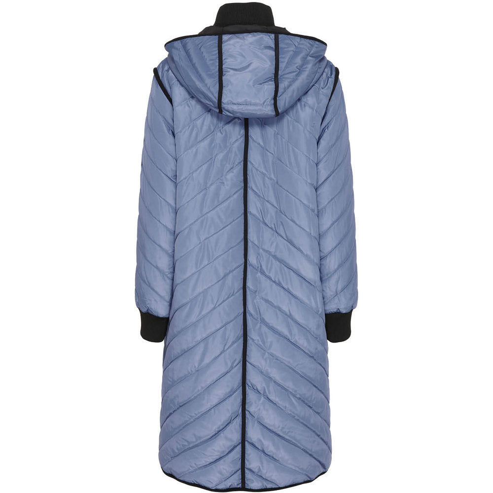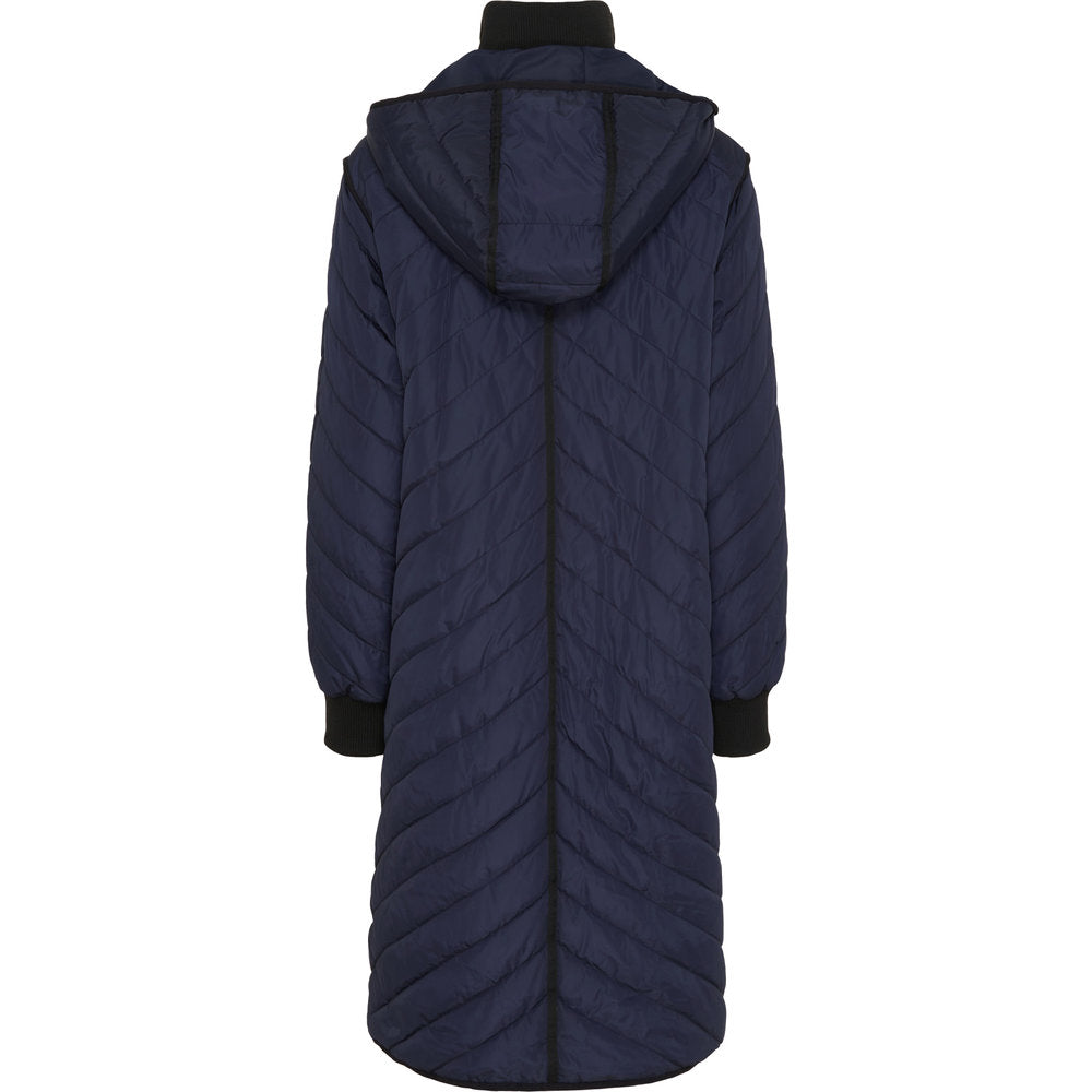 Elegant lang overgangsfrakke med fine detaljer i messing/guld. Jakken har en rummelig pasform, som klæder alle kvinder.